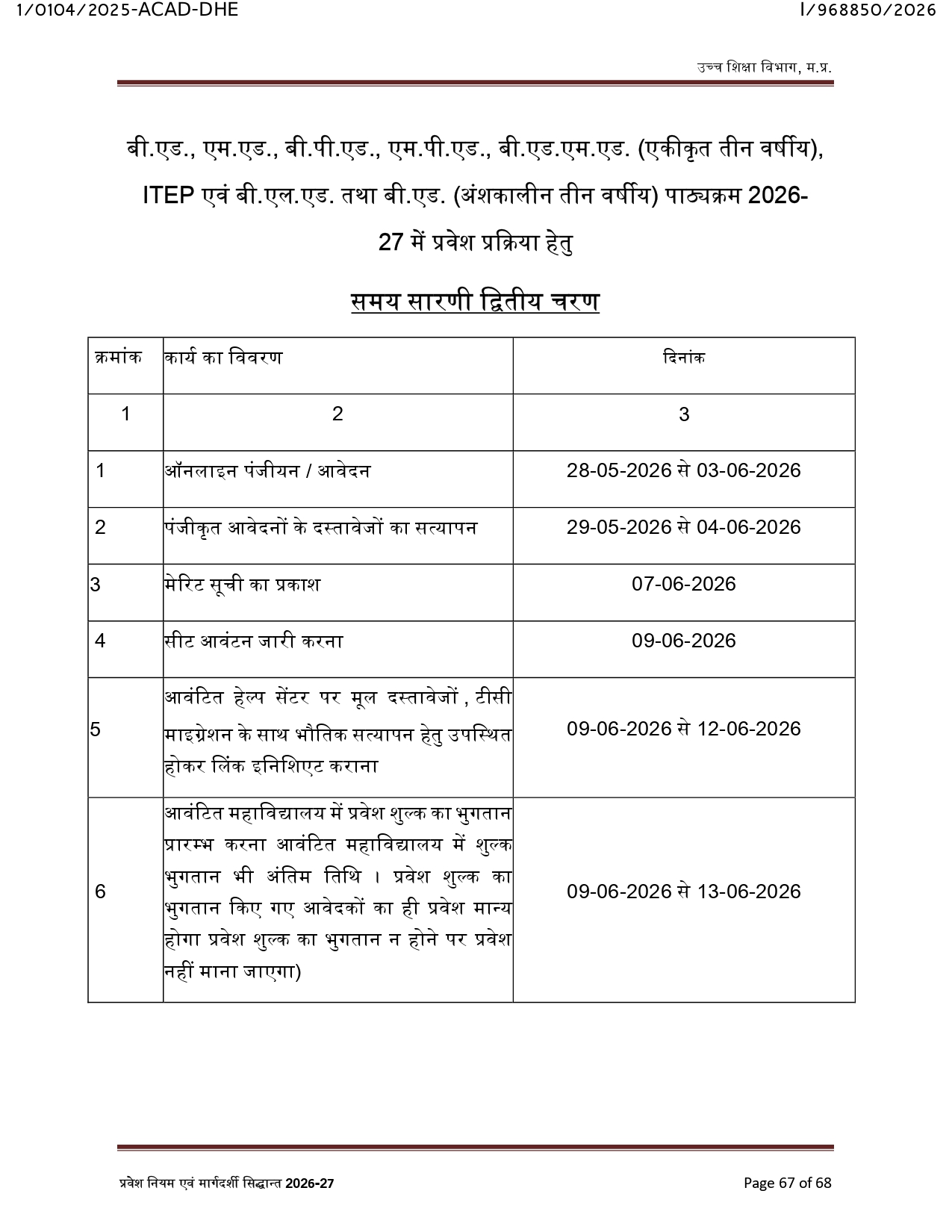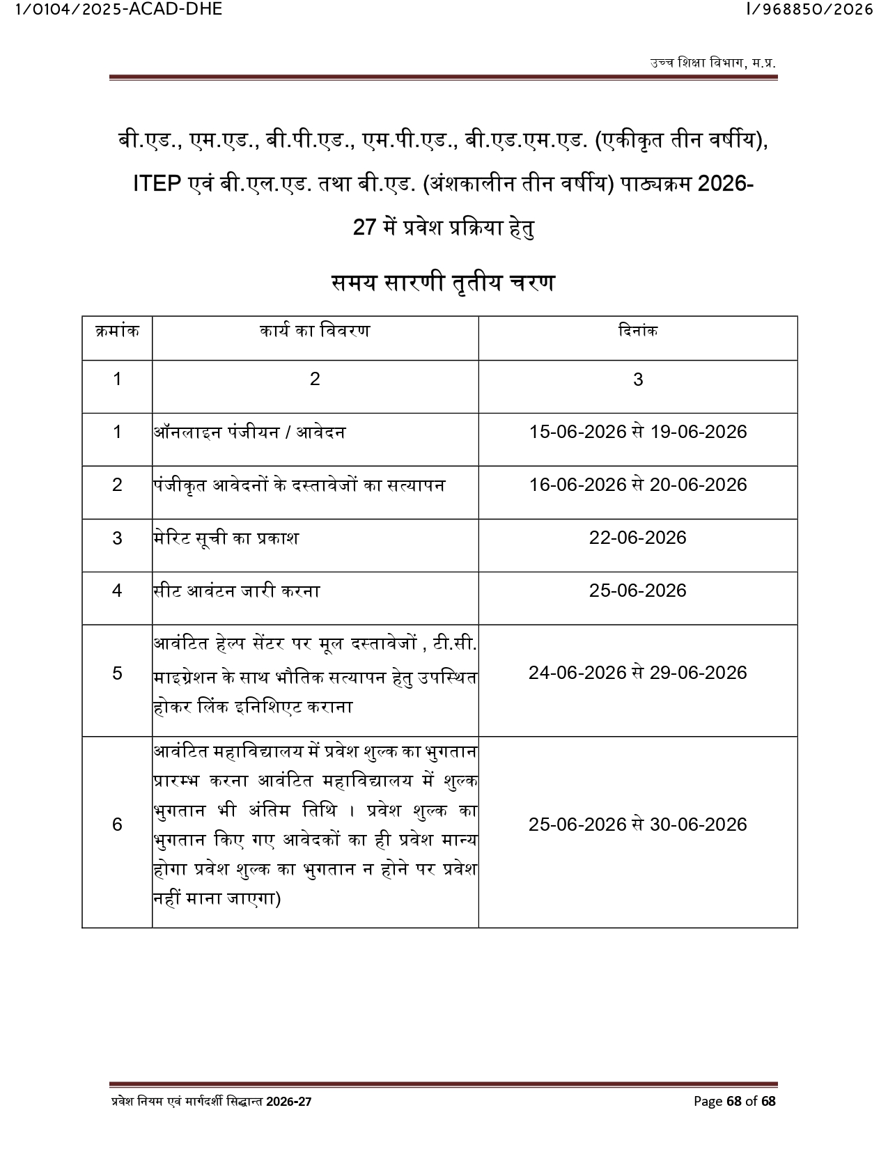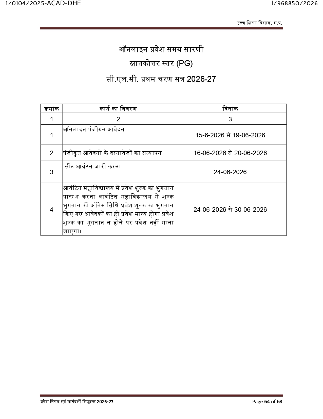 Online Admission Time Table PG CLC 1st Phase 2026-27