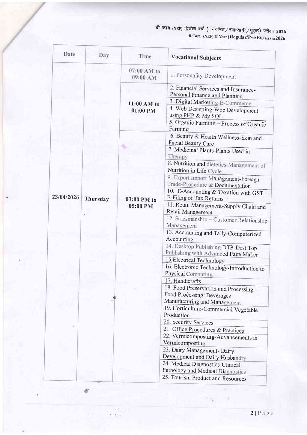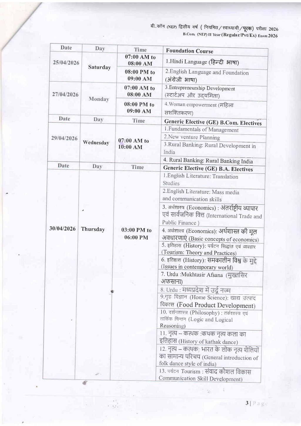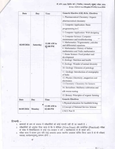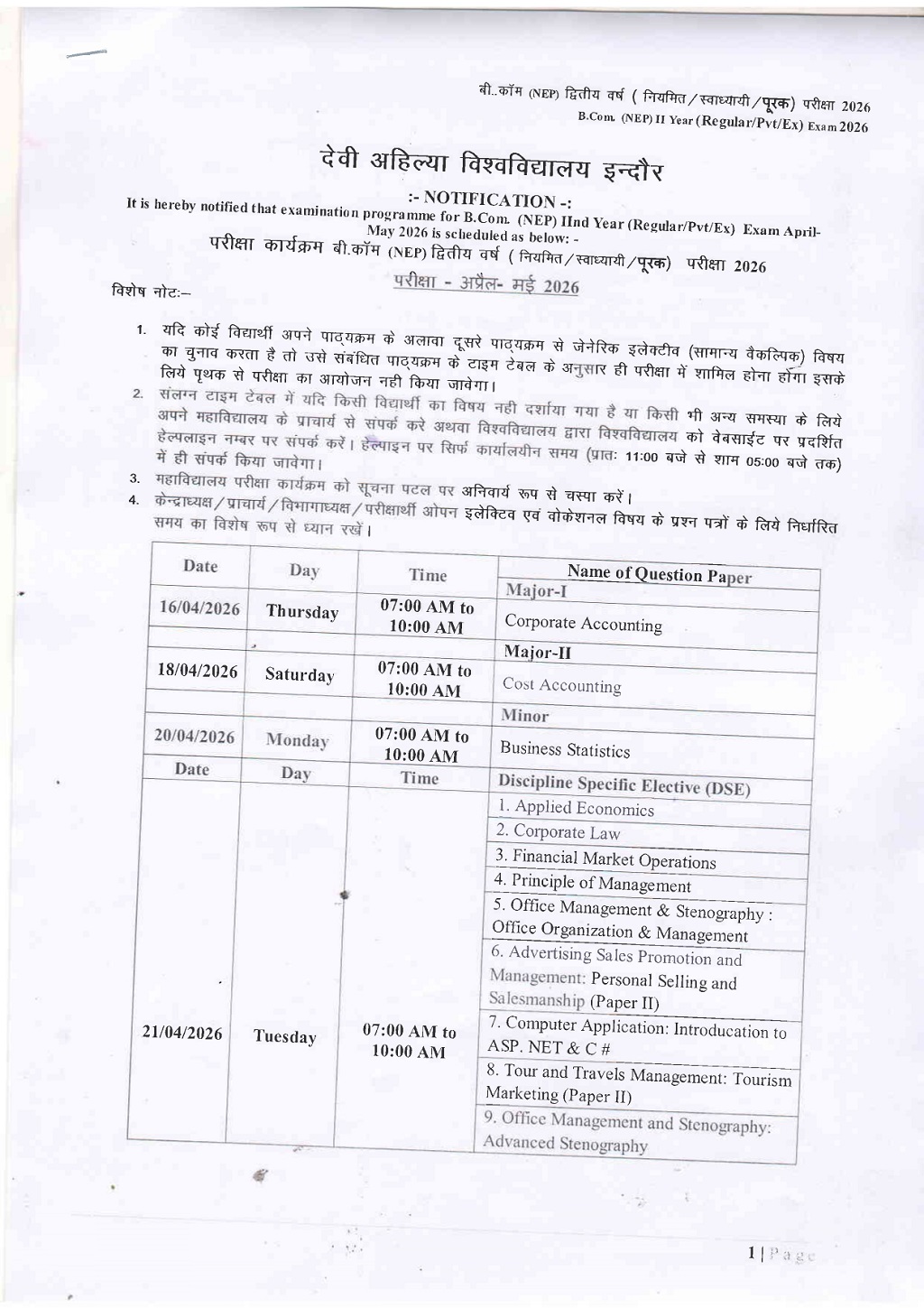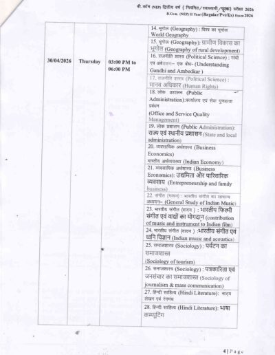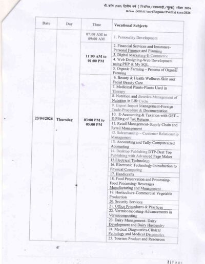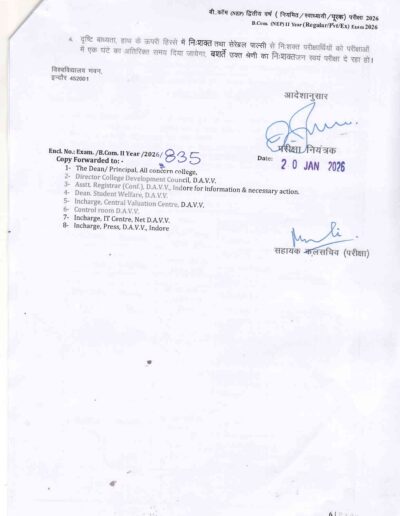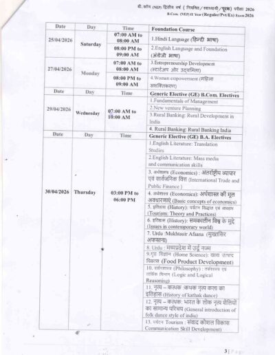 B.Com 2nd Year Time Table DAVV Indore