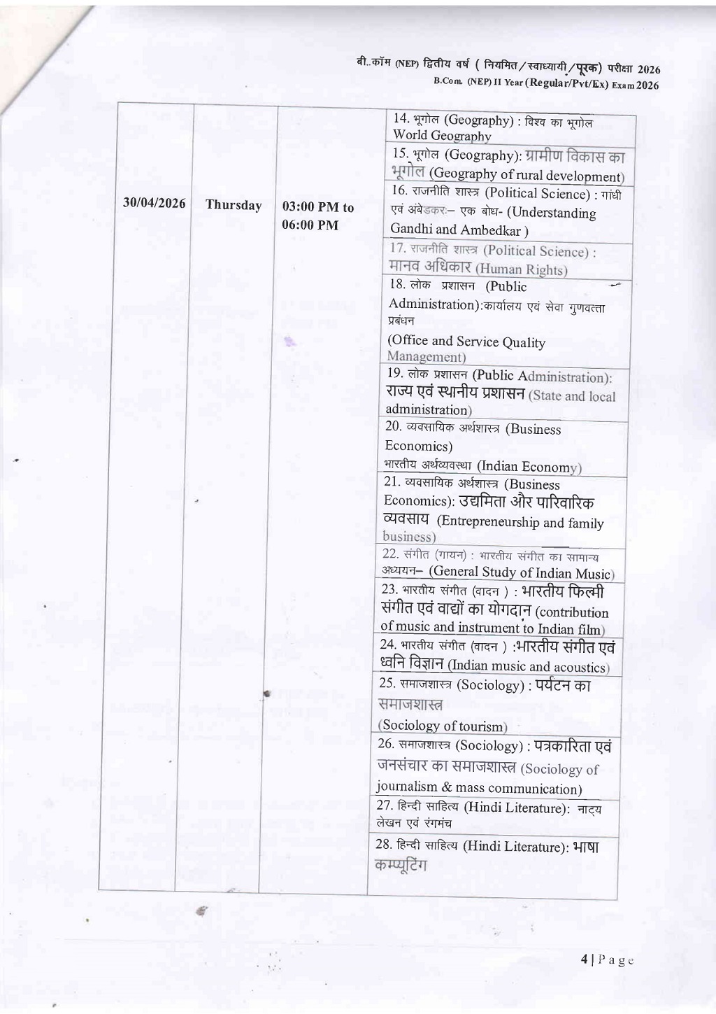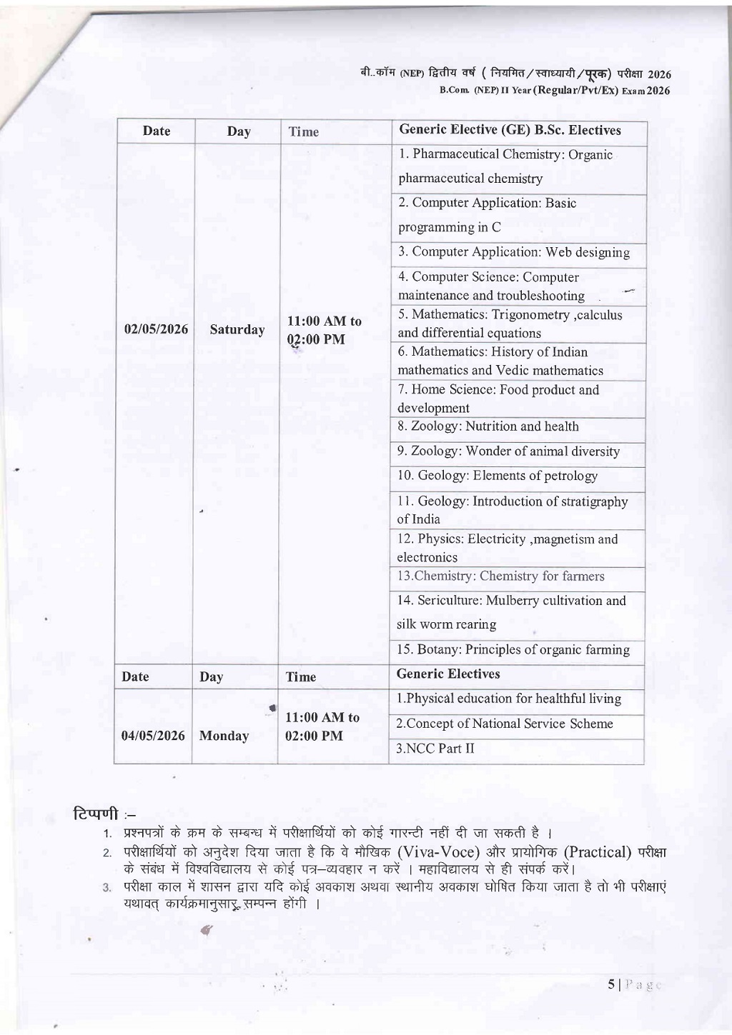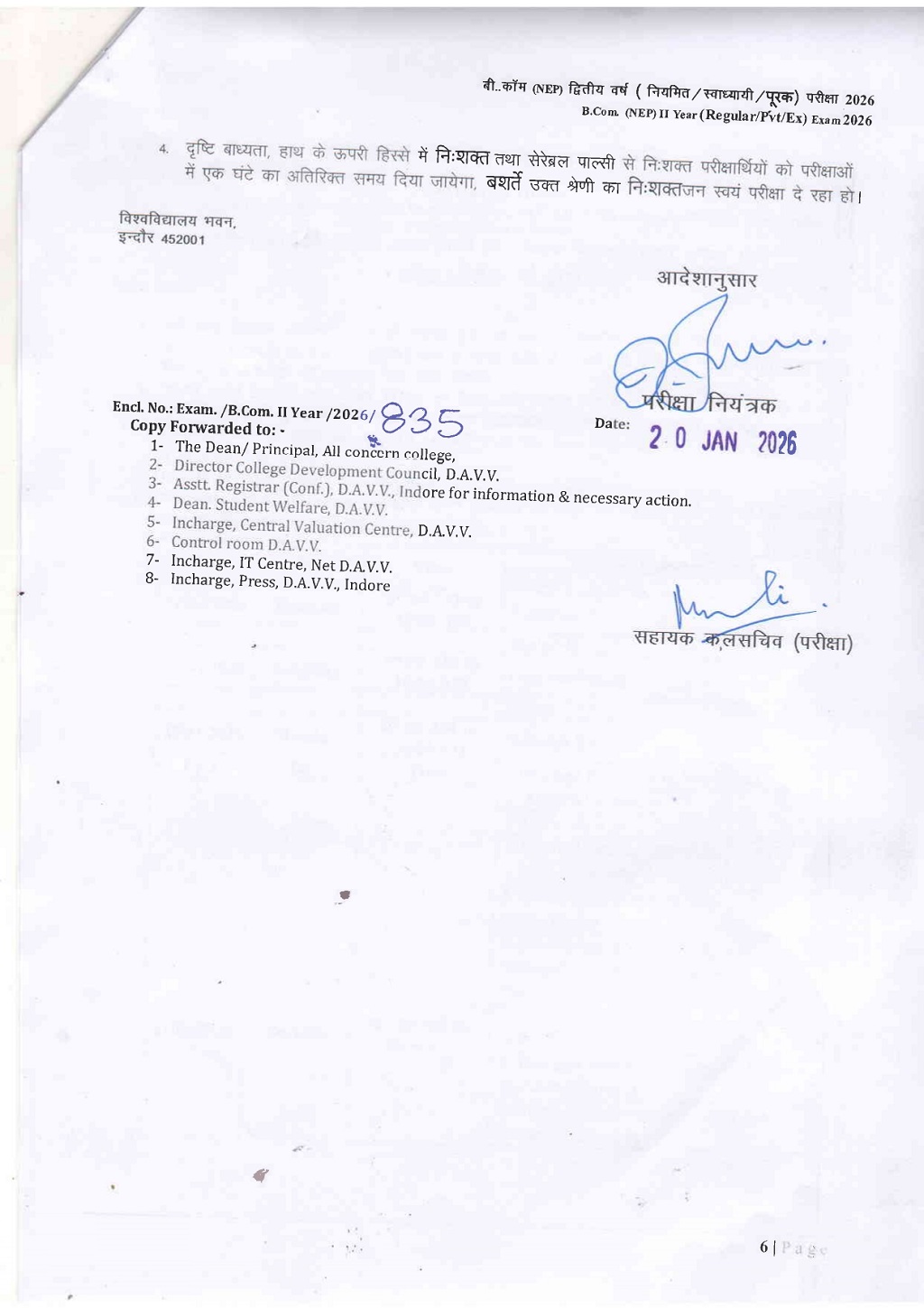 B.Com 2nd Year Time Table DAVV Indore