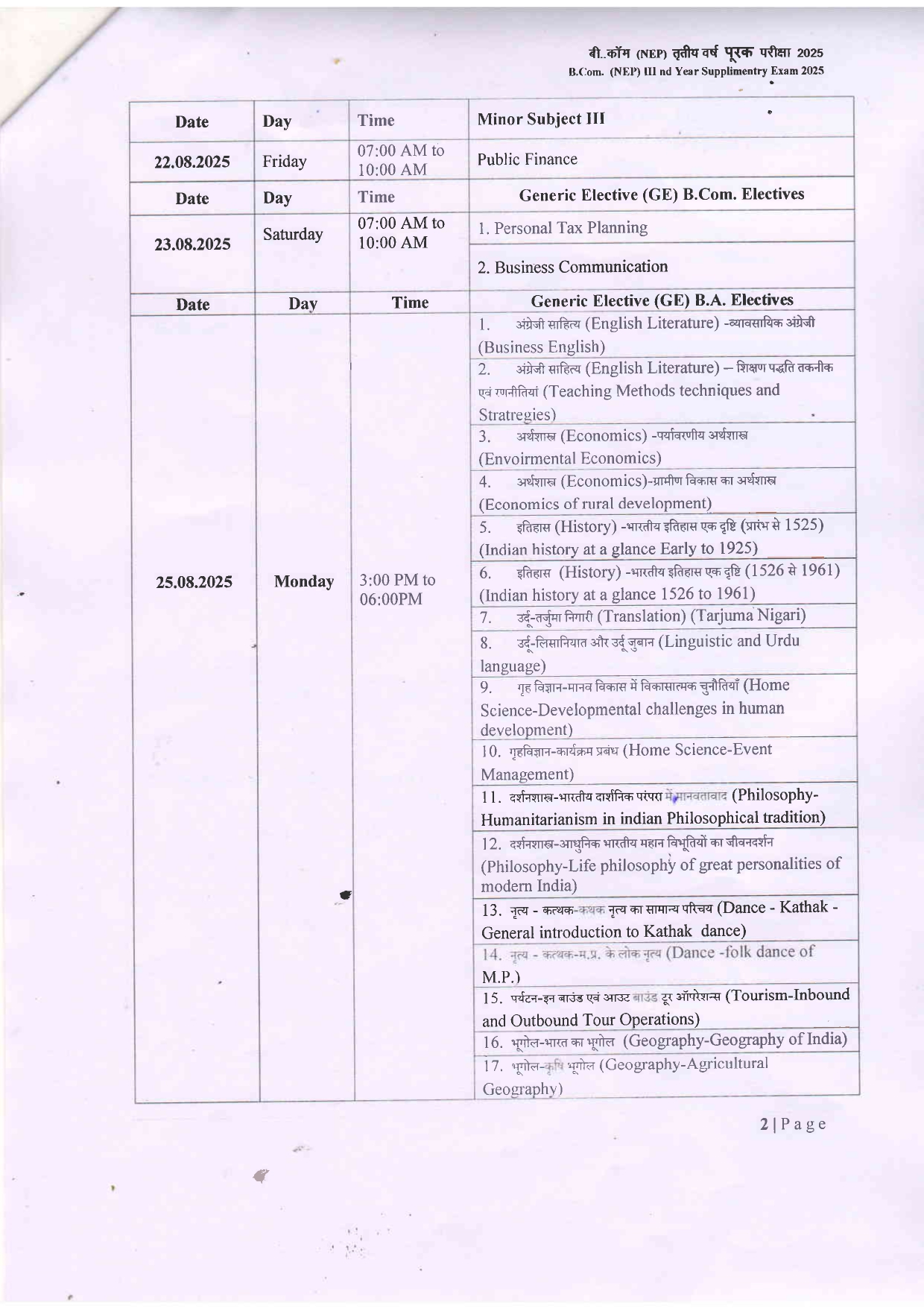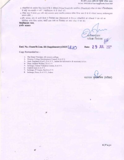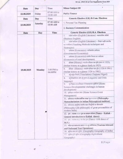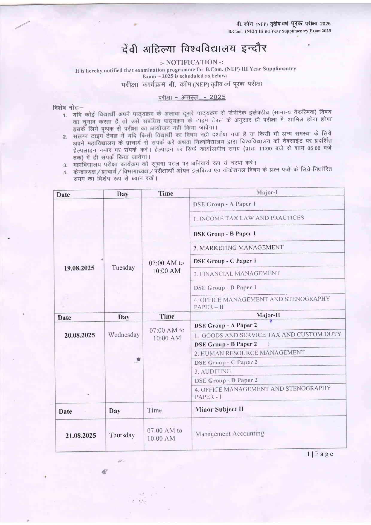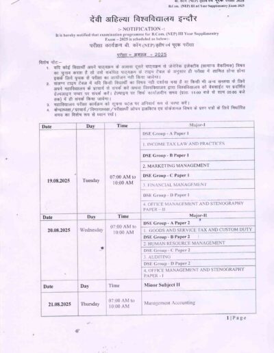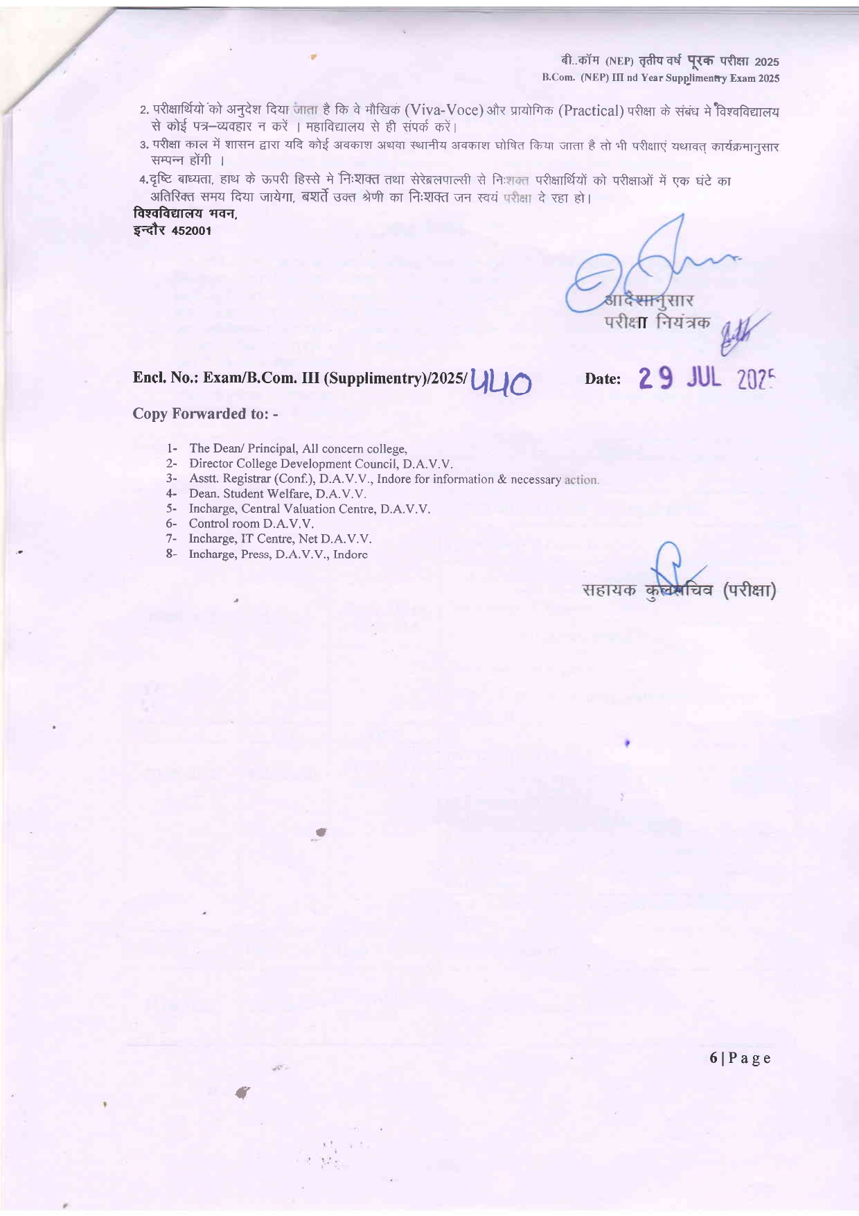 B.Com 3rd year Supplimentary Examination Time Table DAVV Indore