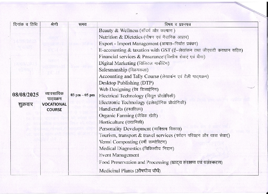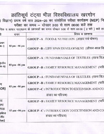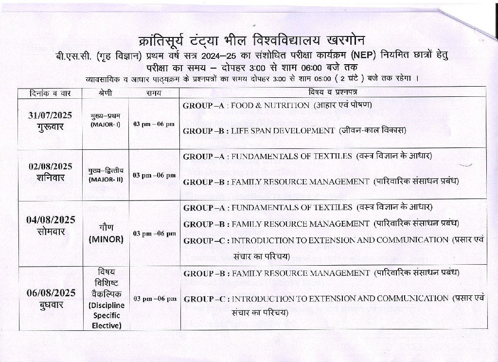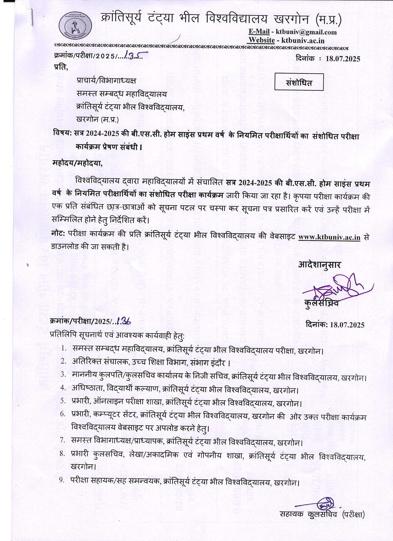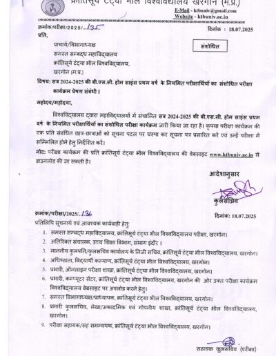 - Examination Notice : B.H.Sc 1 year Supplementary Exam Time Table Notification of KTB University Khargone MP