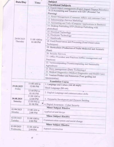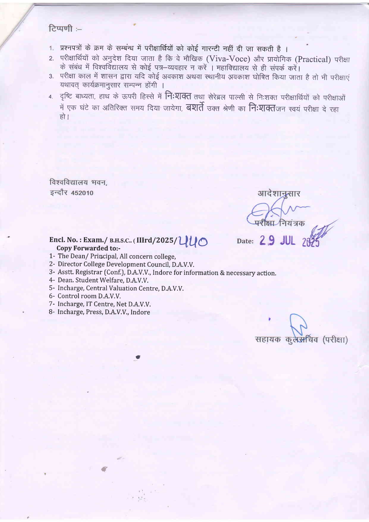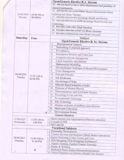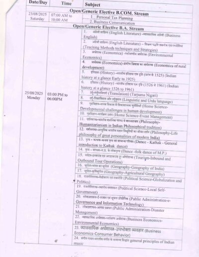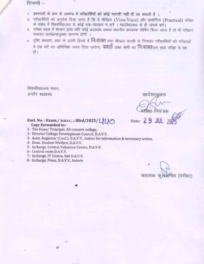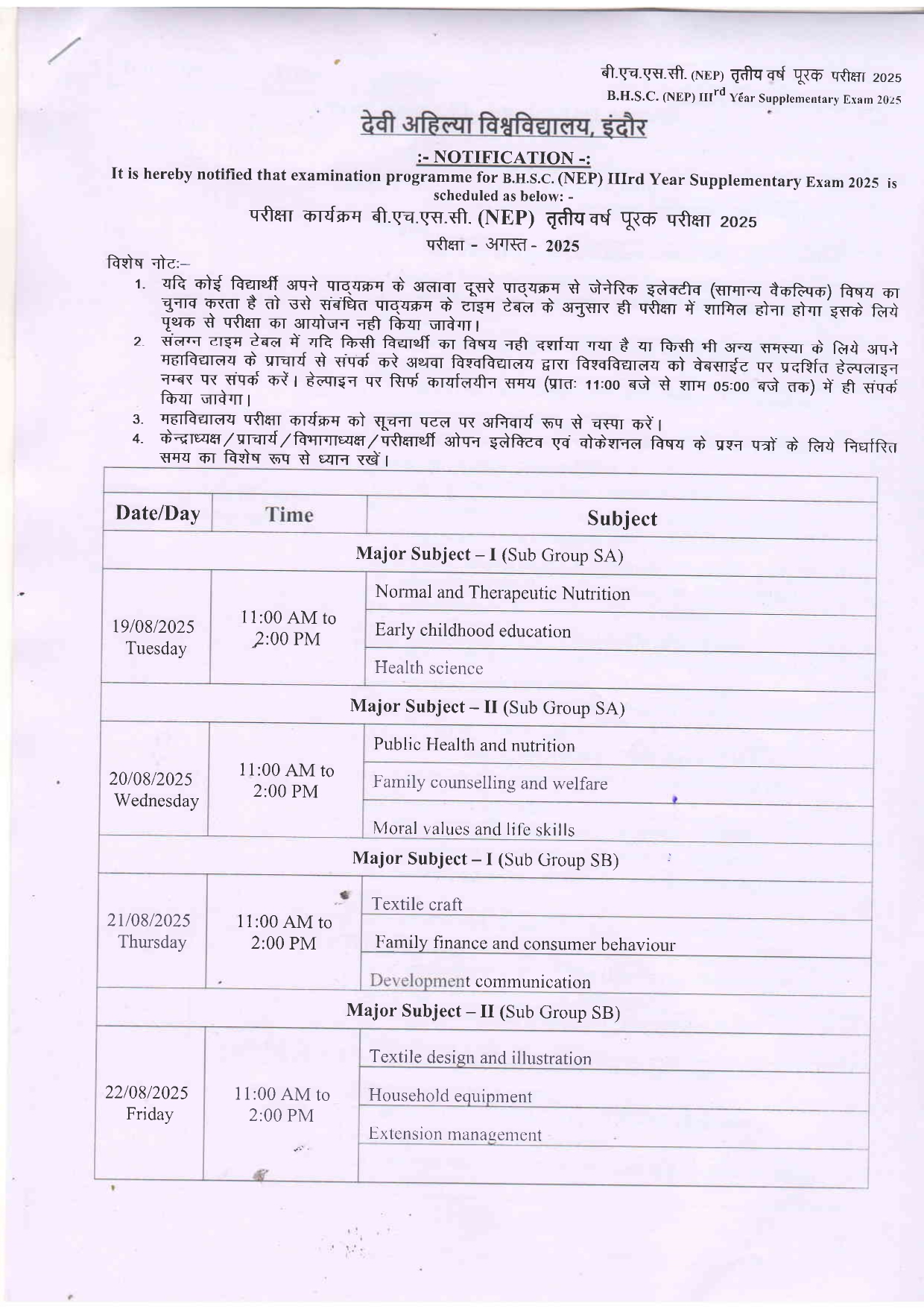B.H.Sc 3rd year Supplimentary Examination Time Table DAVV Indore