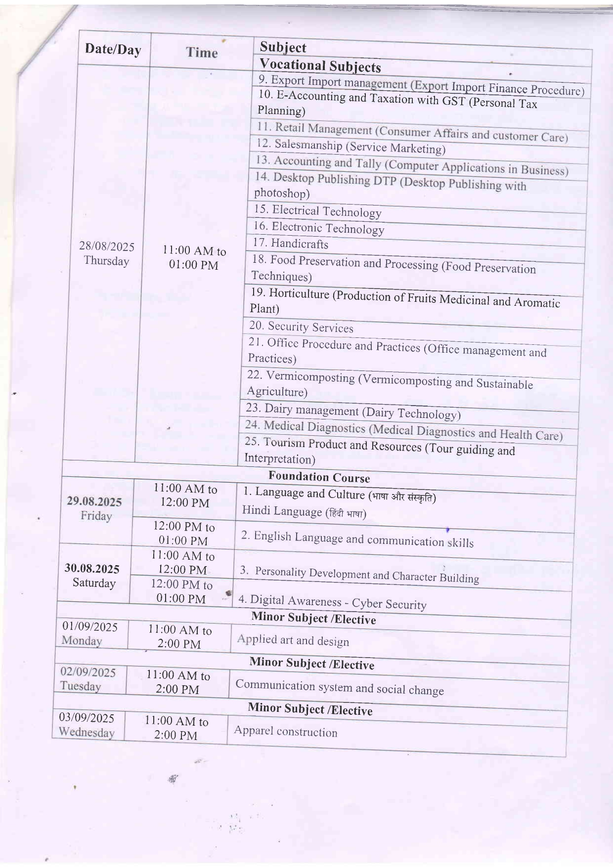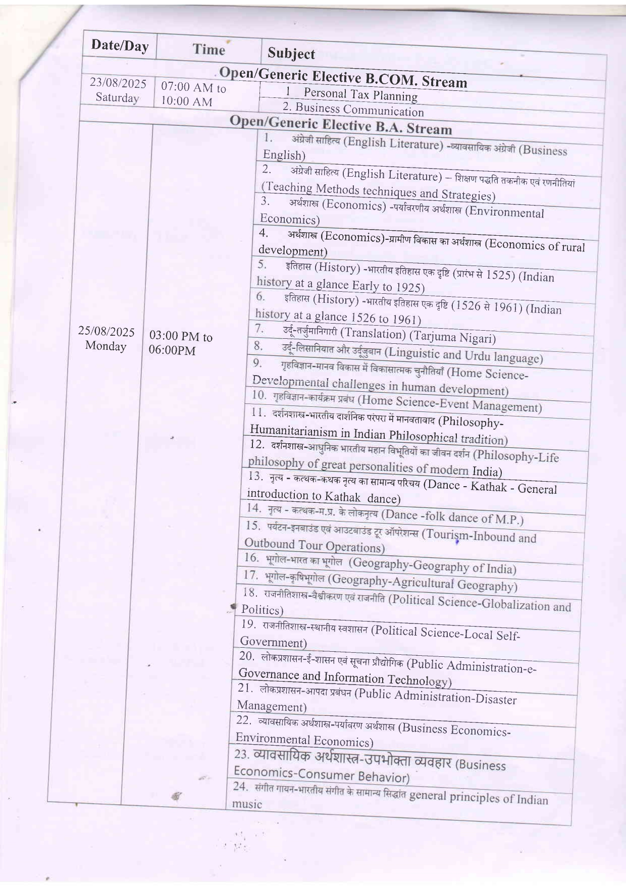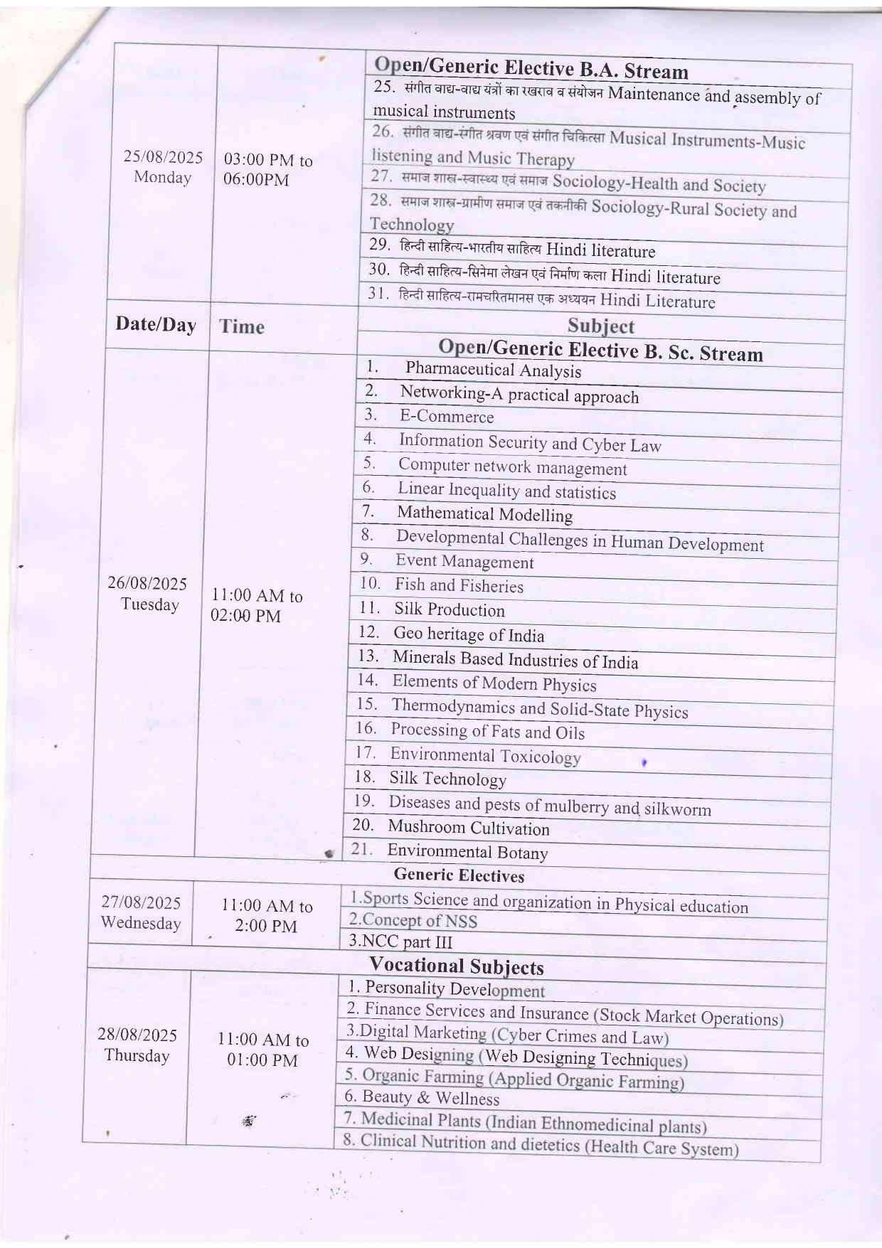 B.H.Sc 3rd year Supplimentary Examination Time Table DAVV Indore