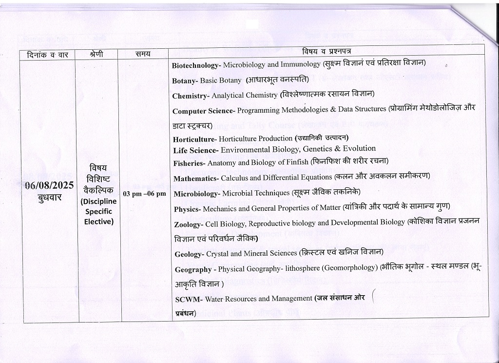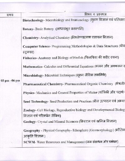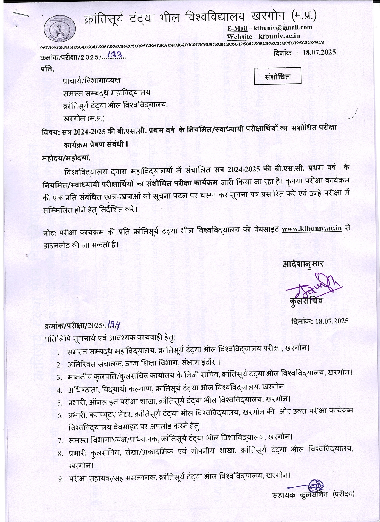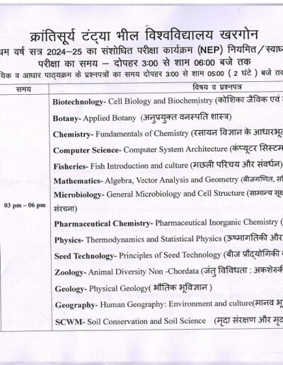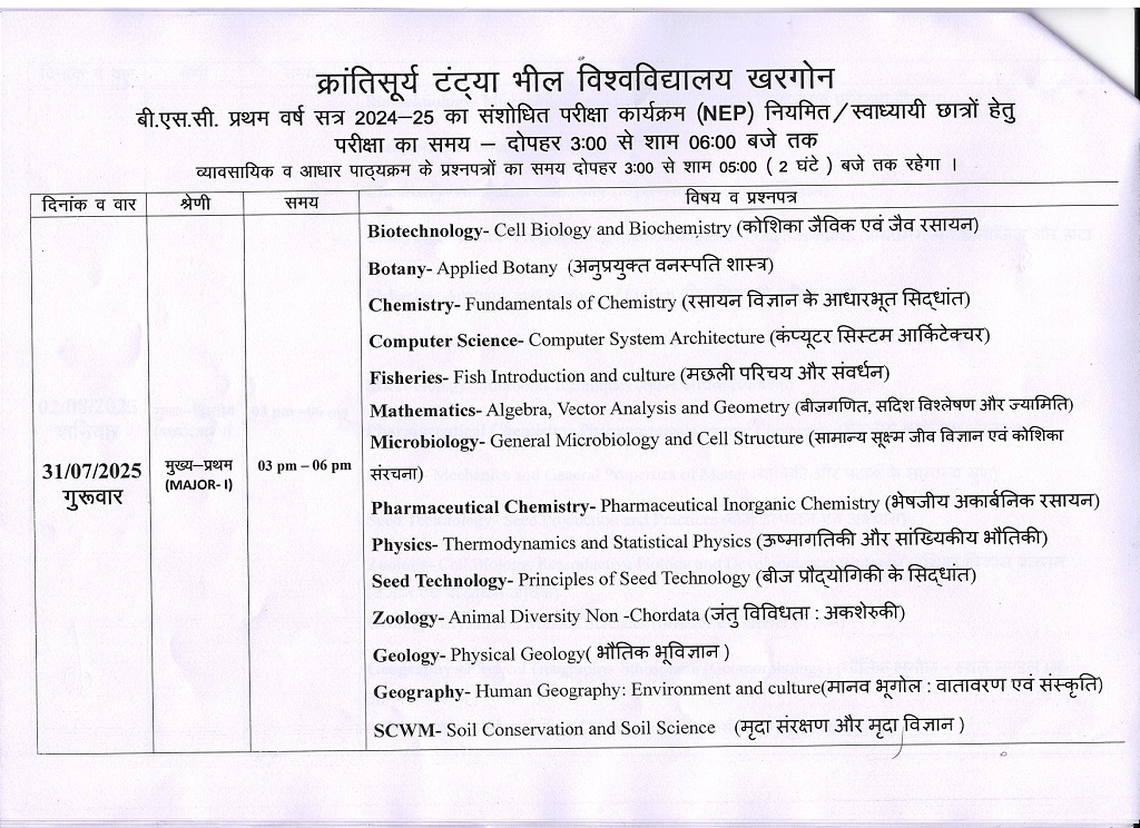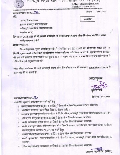 B.Sc 1st Year Revised Exam Time Table KTB University Khargone