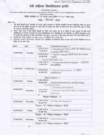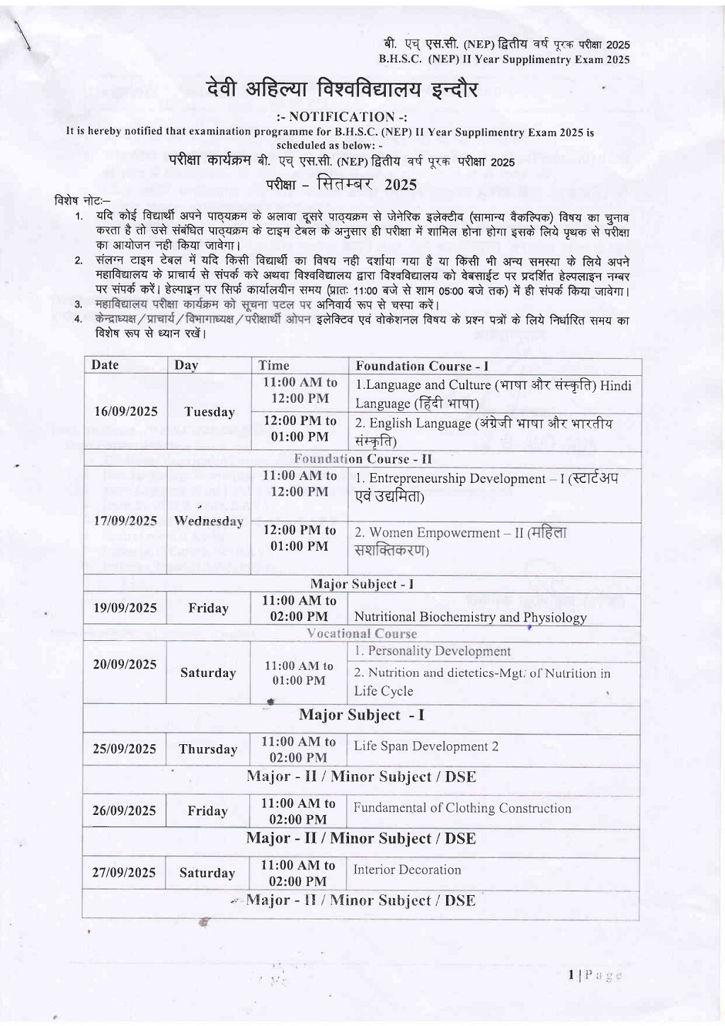 - Examination Notice : B.H.Sc 1 year Supplementary Exam Time Table Notification of KTB University Khargone MP
