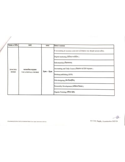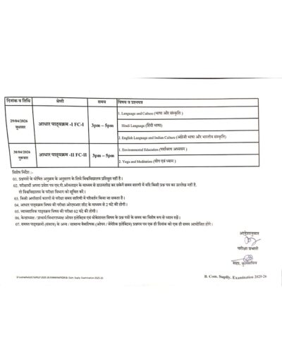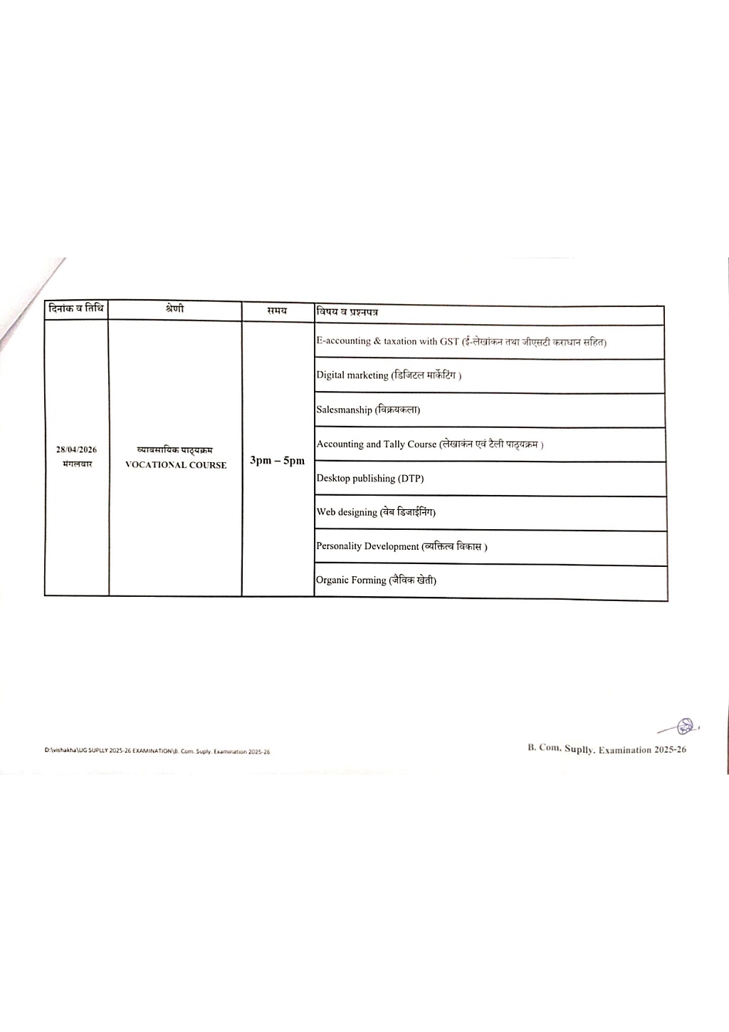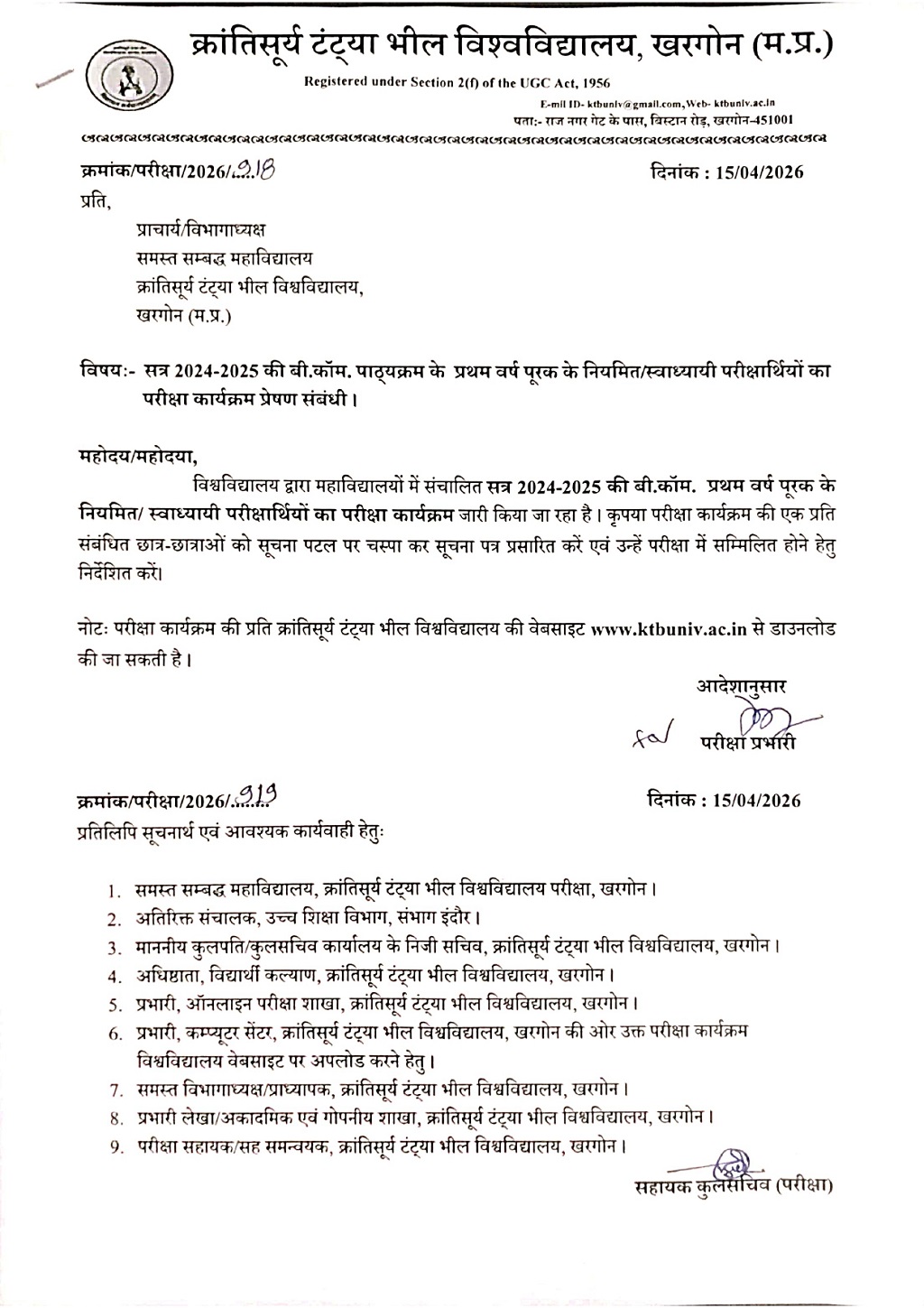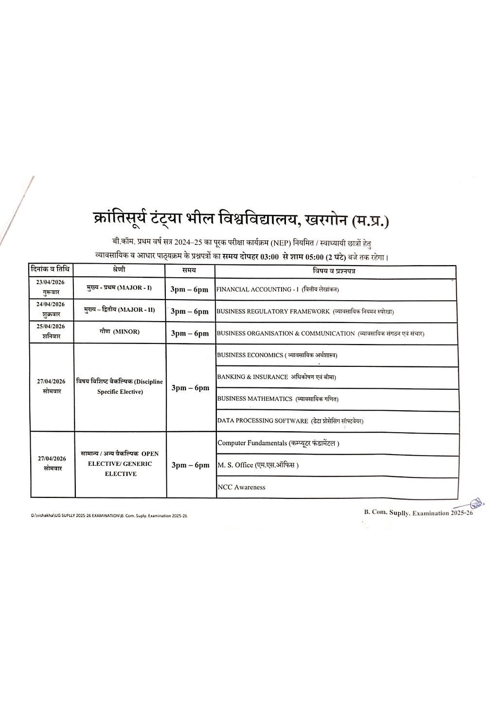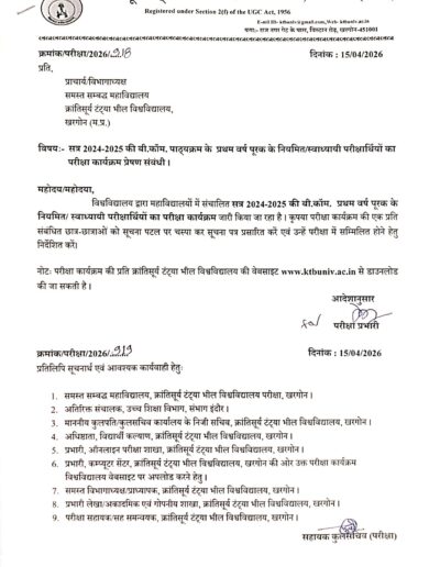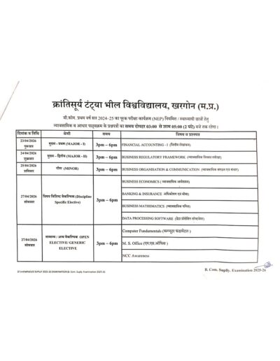 - Examination Notice : B.Com 1 year Supplementary exam Time Table Notification of KTB University Khargone MP