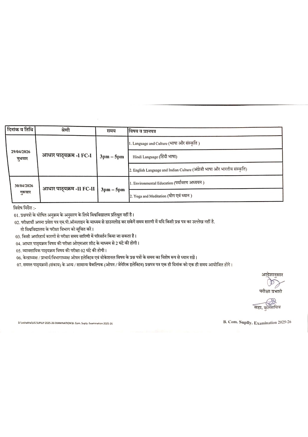 - Revised Examination Time Table : B.Com II Year Supplementary Exam Time Table Of DAVV Indore MP