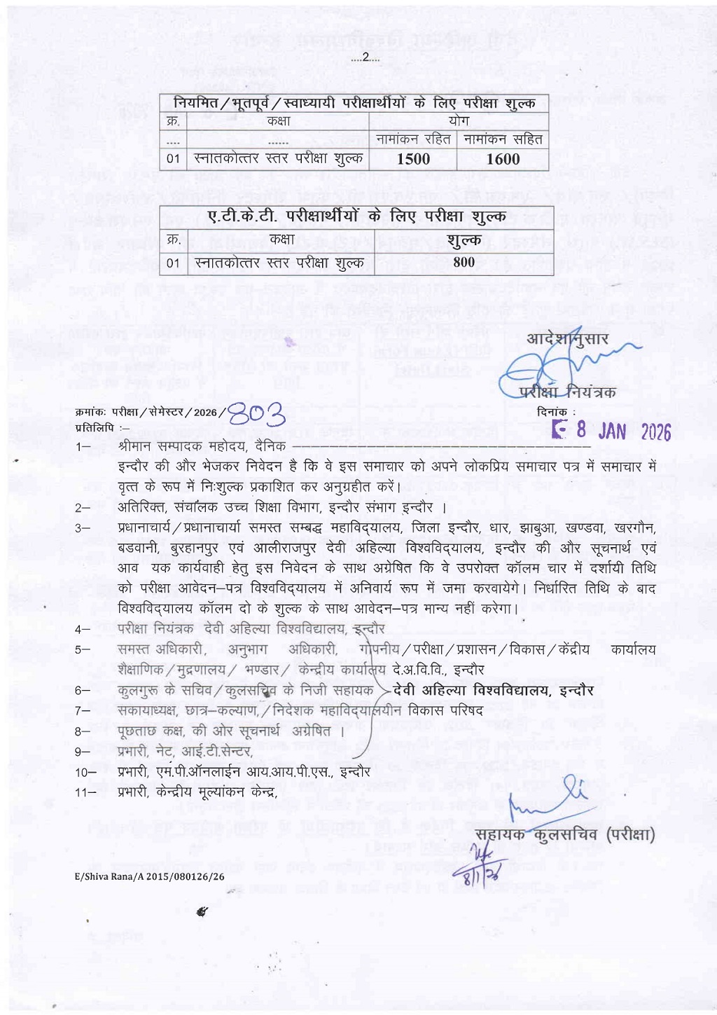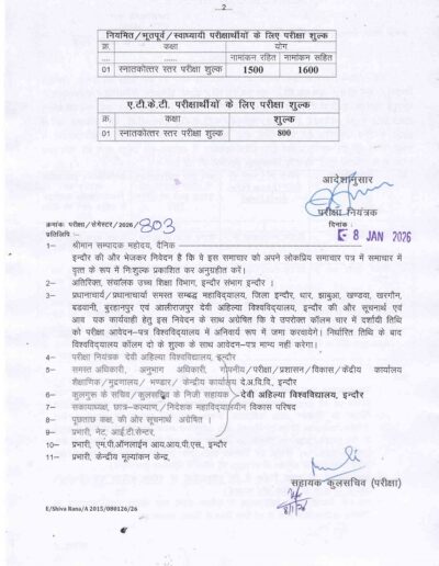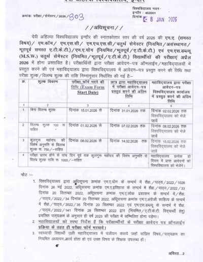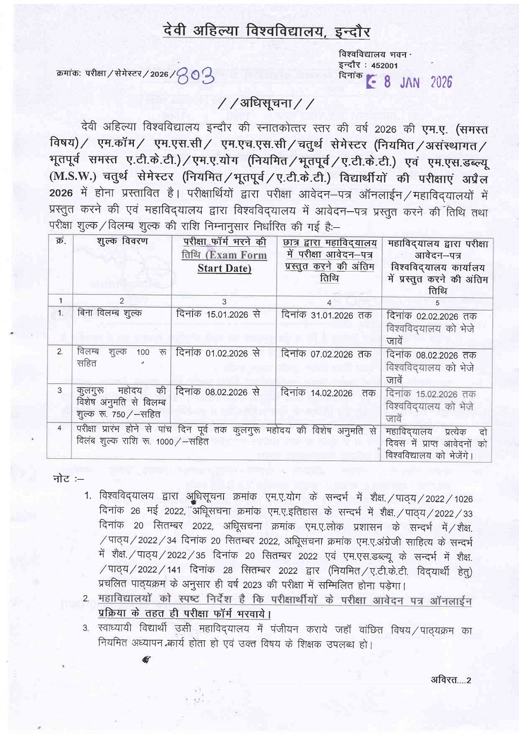 Examination notification: Challan Date of M.Sc IV Semester ( Reg/ Supply) DAVV Indore 2025-26