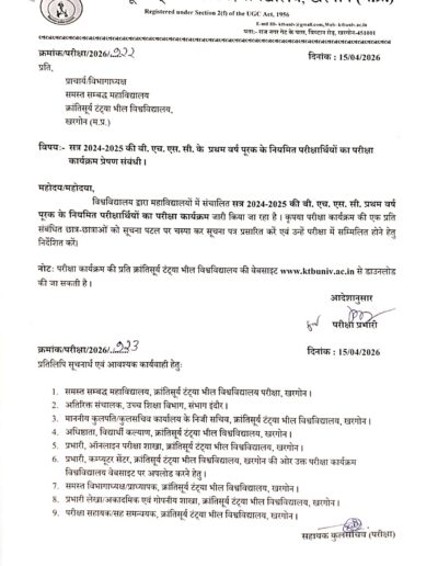 - Examination Notice : B.Sc 1 year Supplementary Exam Time Table Notification of KTB University Khargone MP