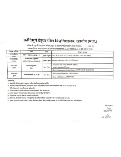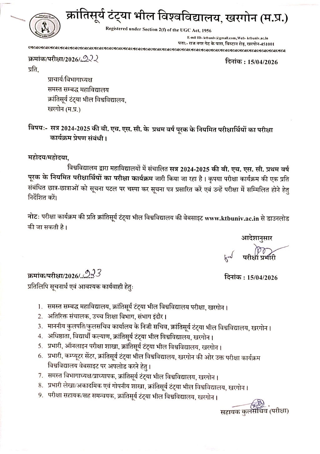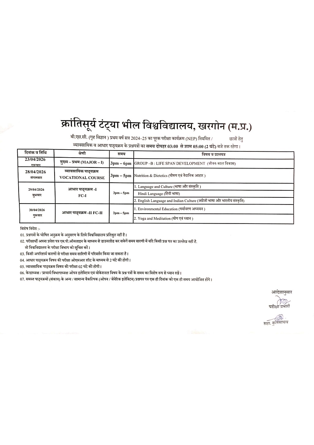 - Examination Notice : B.H.Sc 1 year Supplementary Exam Time Table Notification of KTB University Khargone MP