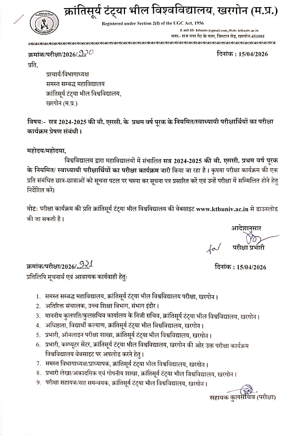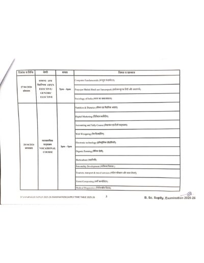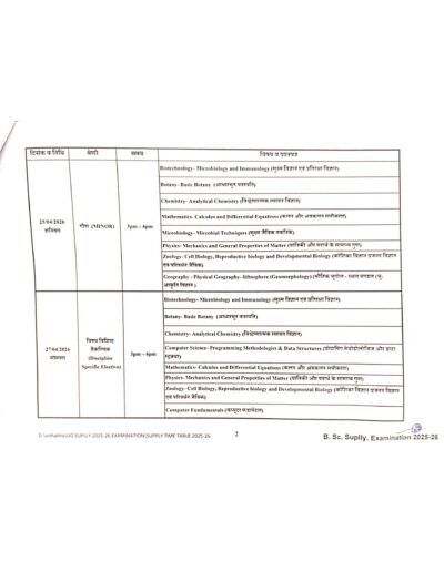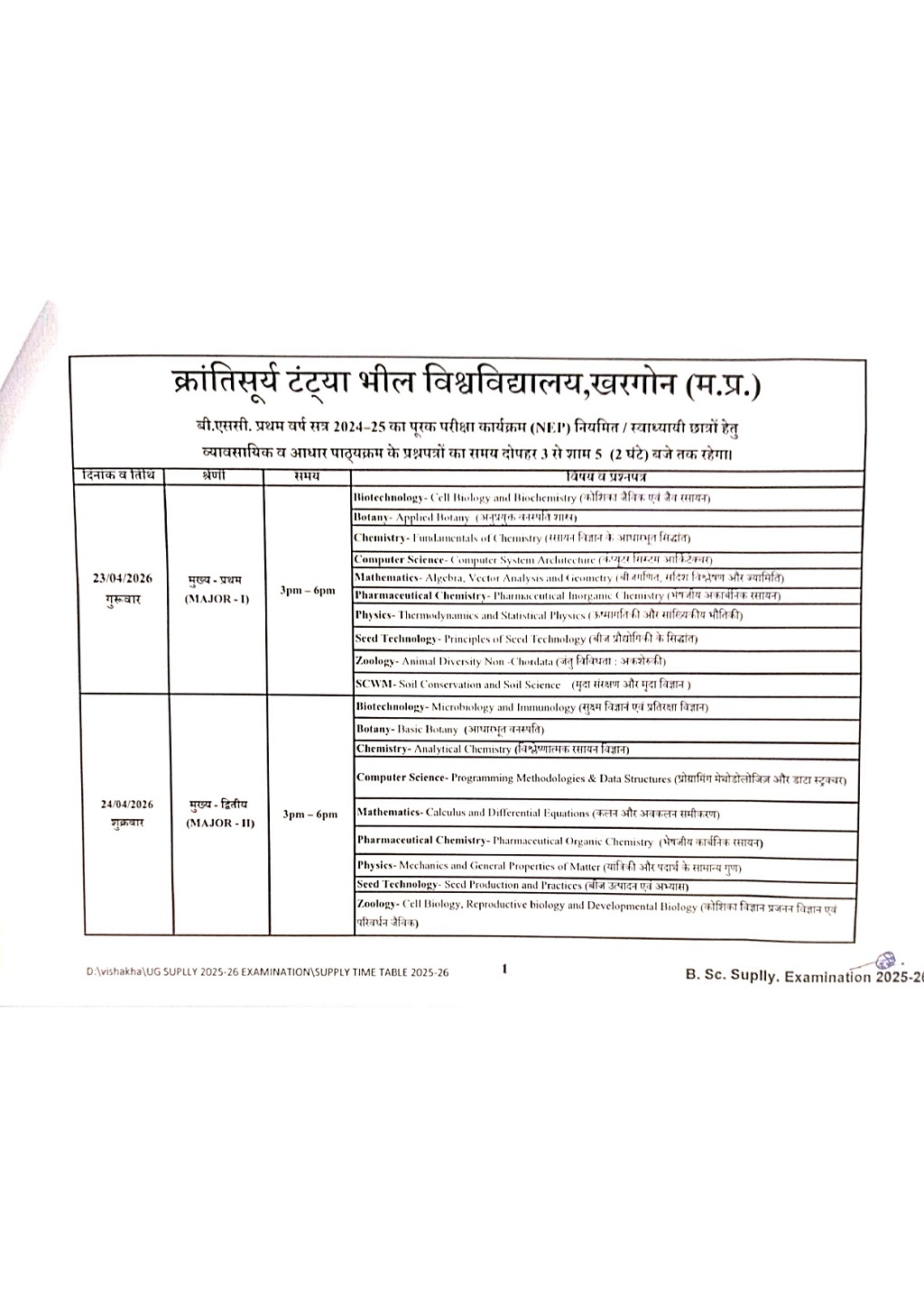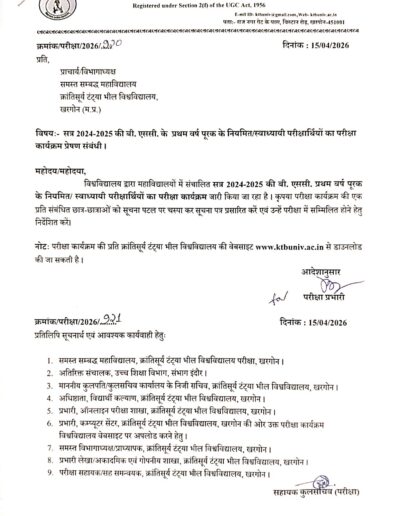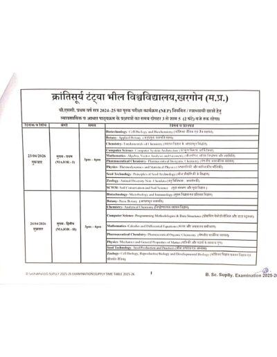 Examination Notice : B.Sc 1 year Supplementary Exam Time Table Notification of KTB University Khargone MP