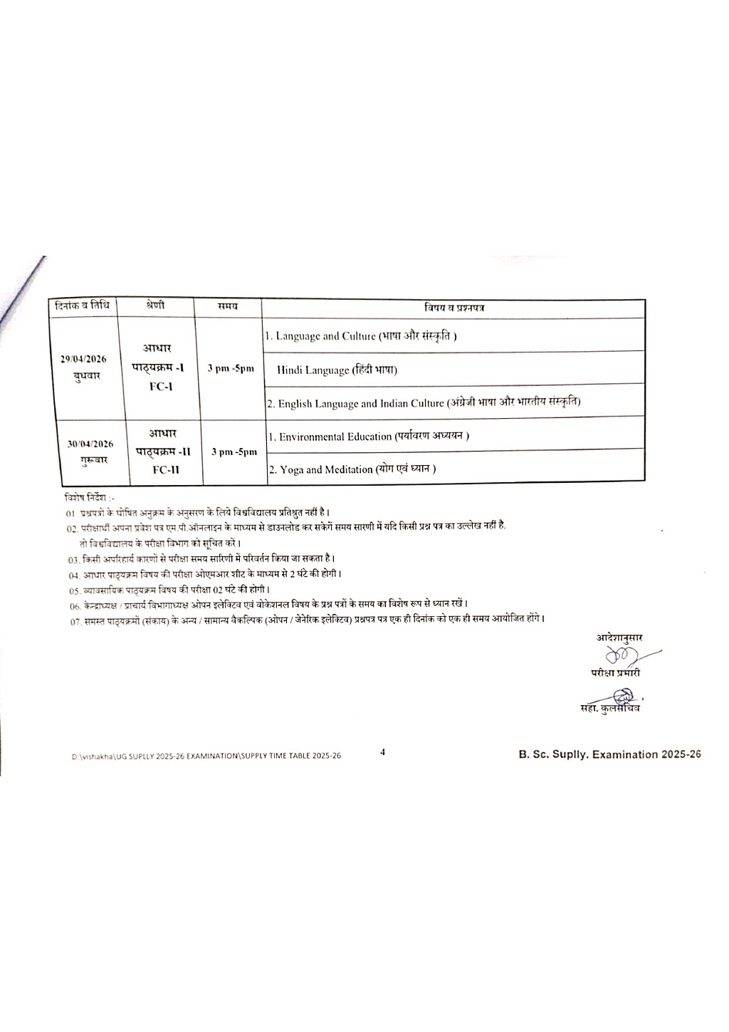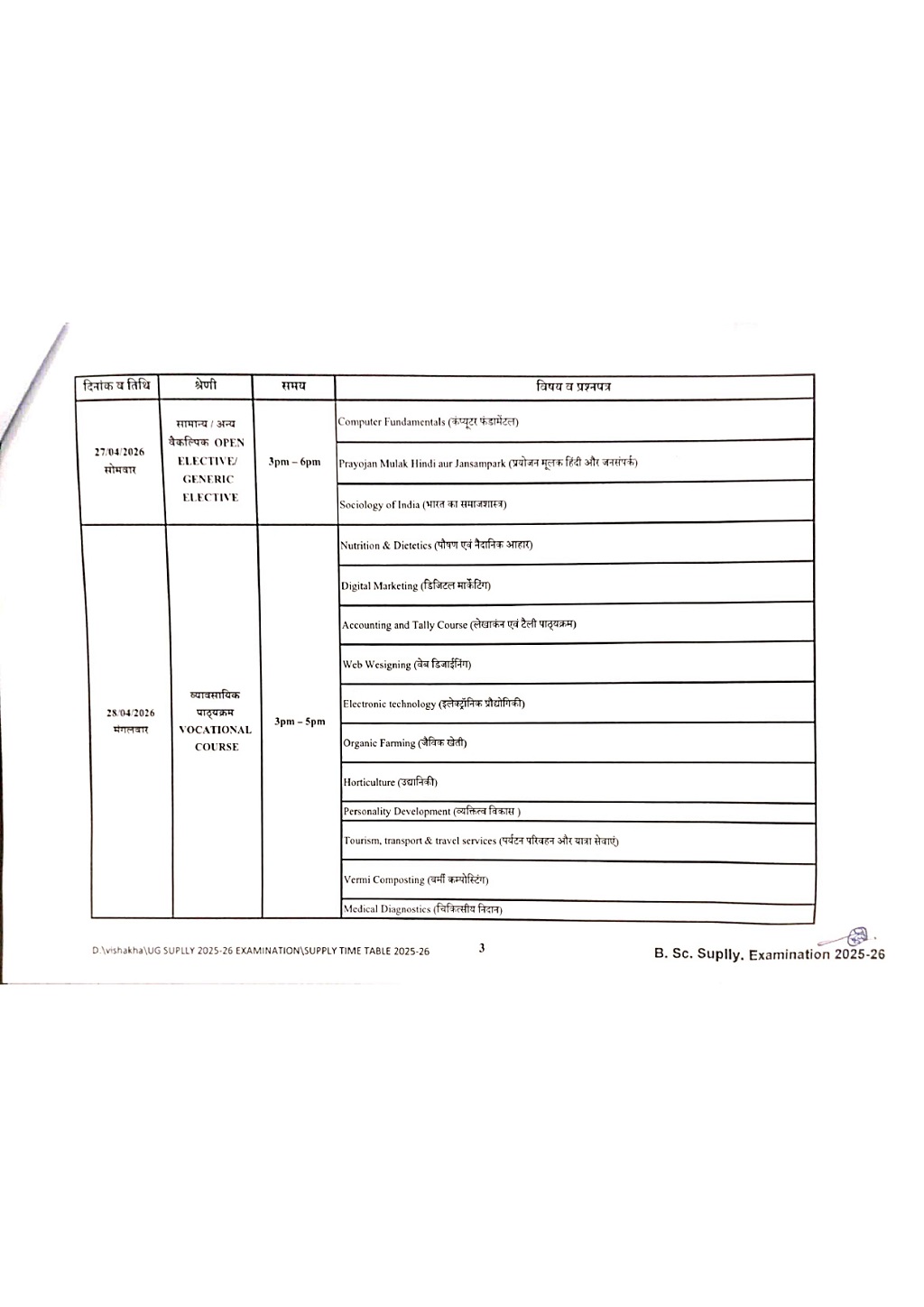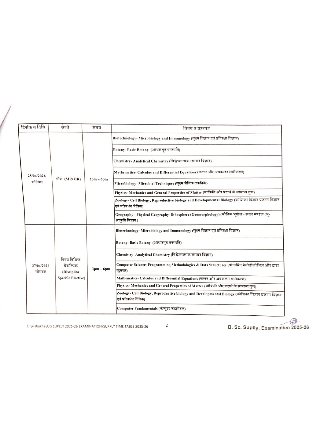 Examination Notice : B.Sc 1 year Supplementary Exam Time Table Notification of KTB University Khargone MP