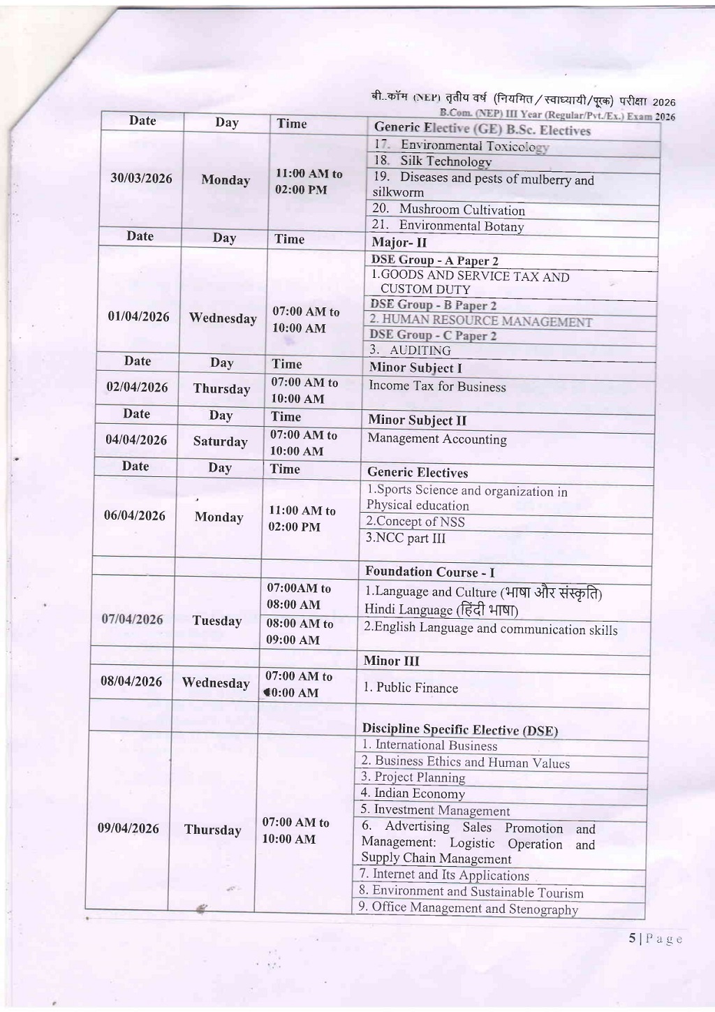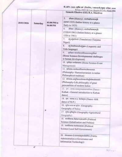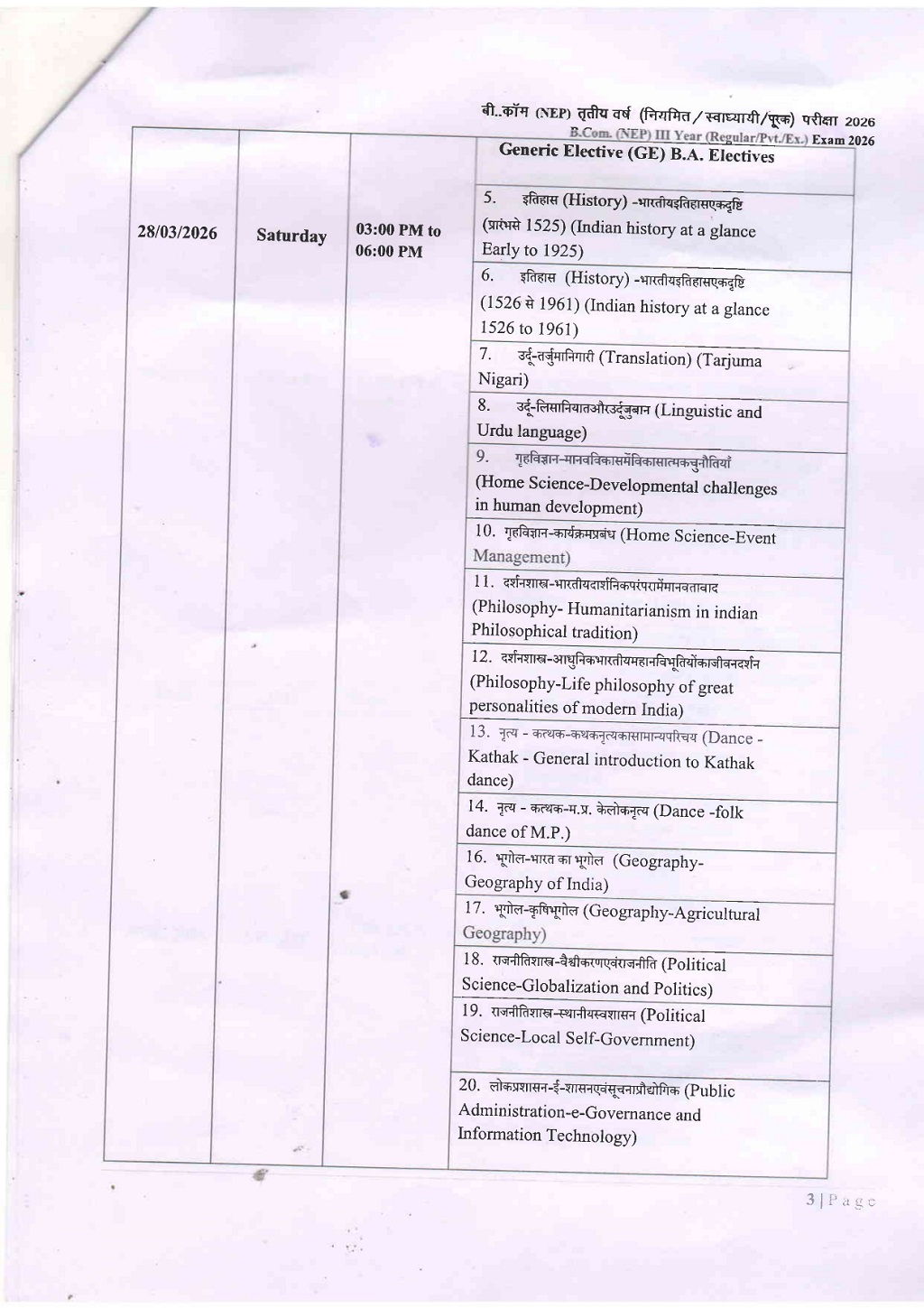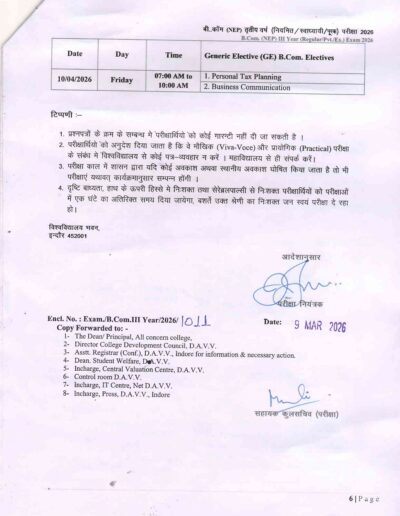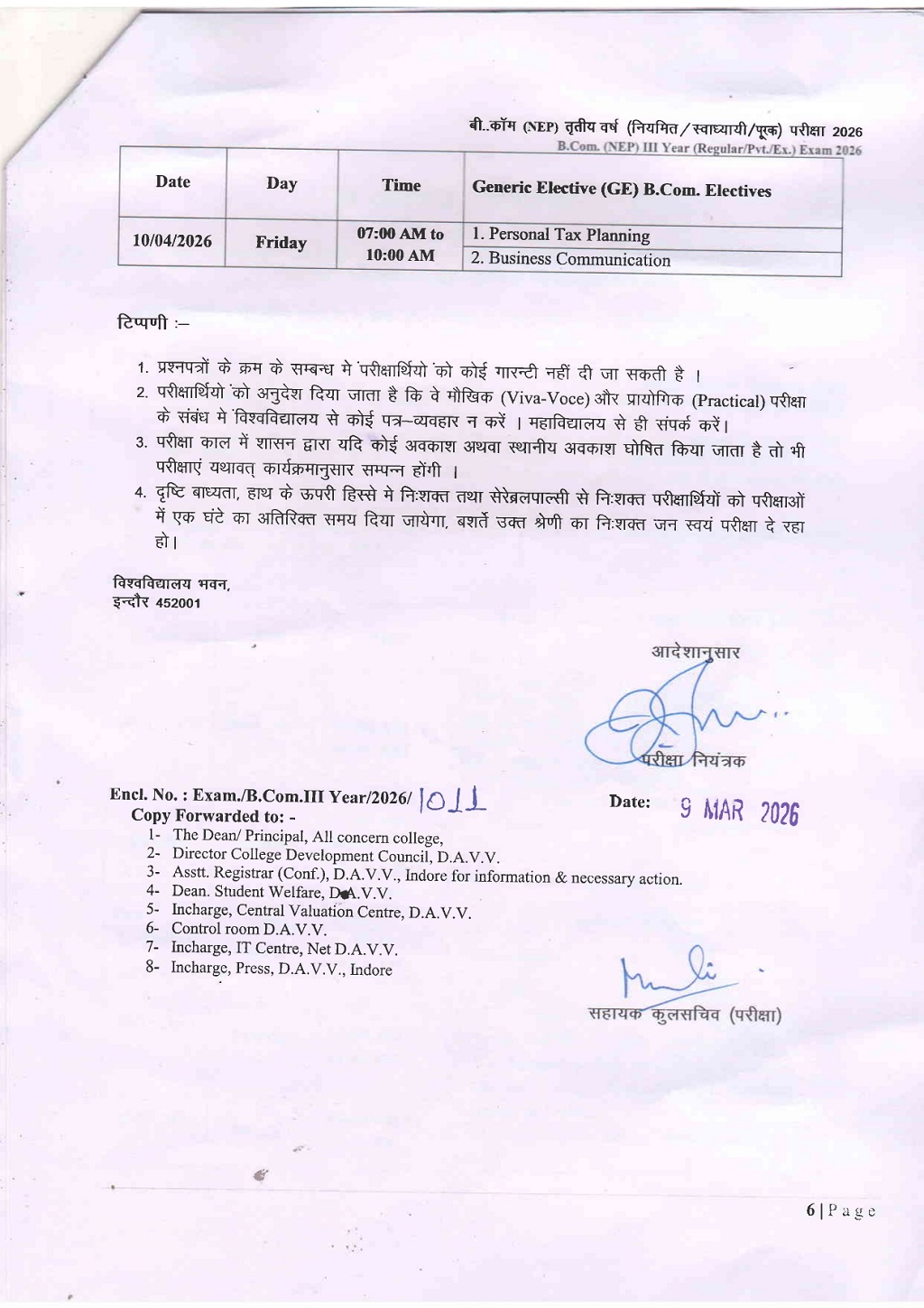 Examination Time Table Notification : Compile Time Table B.Com III Year DAVV Indore MP