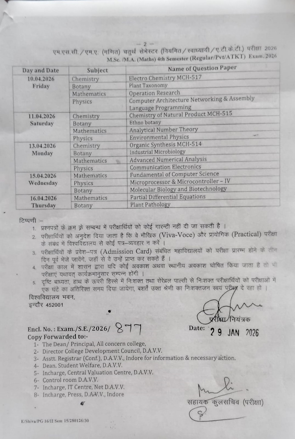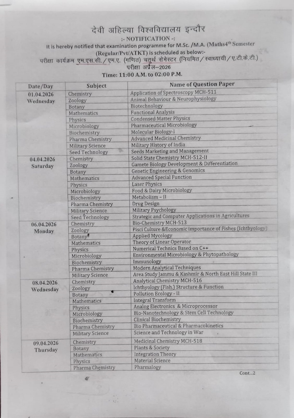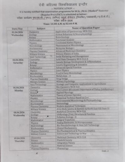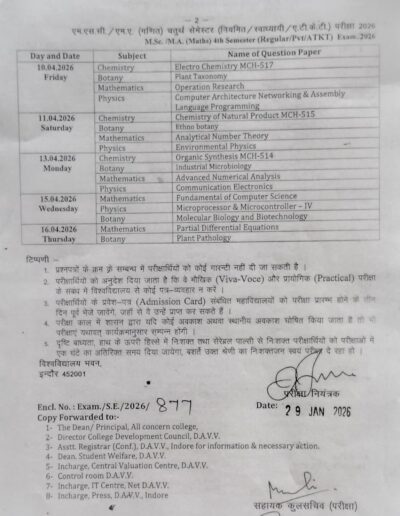 Examination Time Table Notification: M.Sc 4th Semester Time-Table DAVV Indore 2025-26