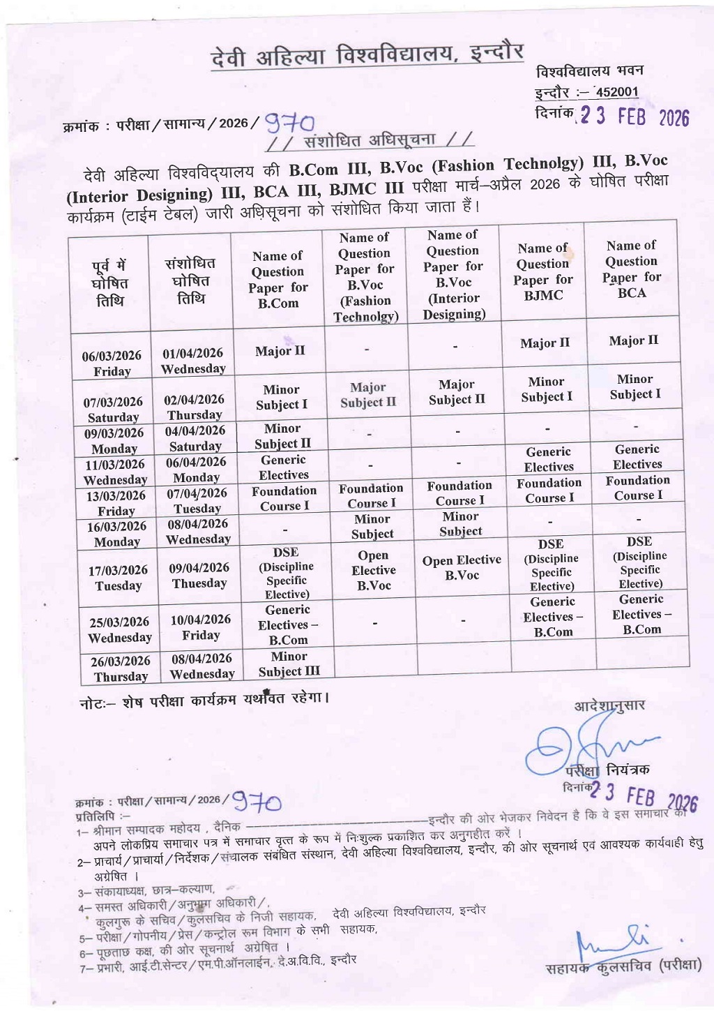 Partial Revised Examination Time Table: B.Com III year DAVV Indore 2025-26